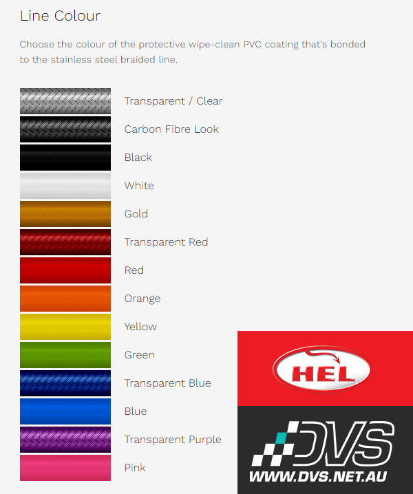 Custom brake lines can be made up with any sheath colour from the options shown here.